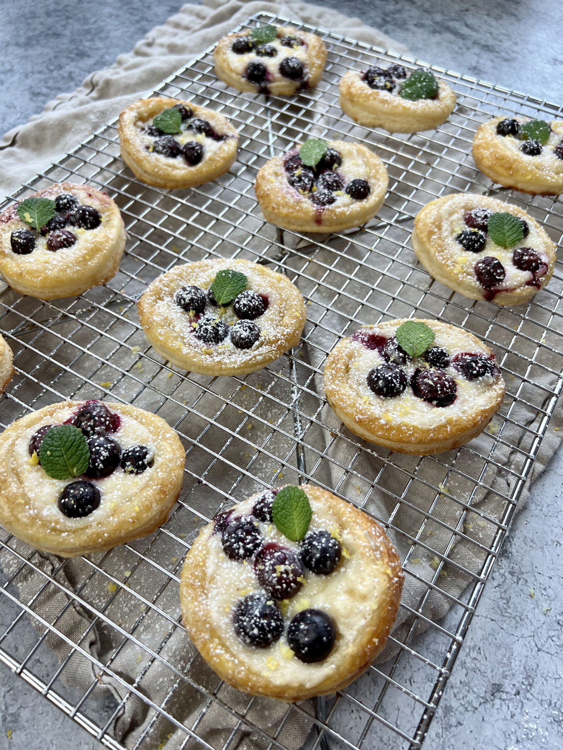 0 Defrost Puff Pastry according to package instructions 1 Wash and pat dry blueberries and set aside 2 To make the filling- mix cream cheese, sugar, vanilla, lemon juice and zest 3 Add your puff pastry to a floured surface, gently roll to flatten it out; use a cookie cutter to make the rounds and smaller size cookie cutter to score (don’t cut all the way through) 4 Add a spoonful of the cream cheese filling, blueberries, brush egg wash and sprinkle coarse sugar and bake in a preheated oven at 400 F for about 20-25 mins 5 Finish with powdered sugar, mint leaves, lemon zest and enjoy!!View original recipe